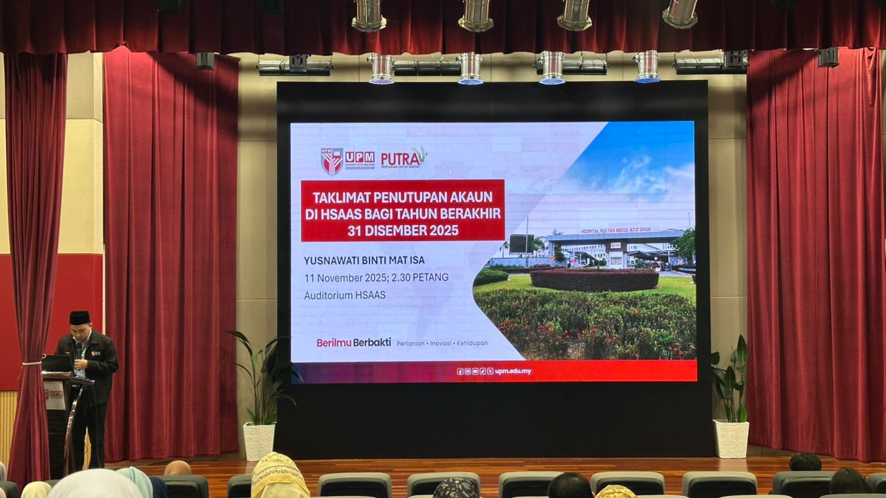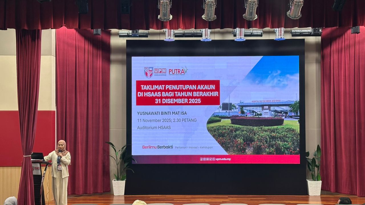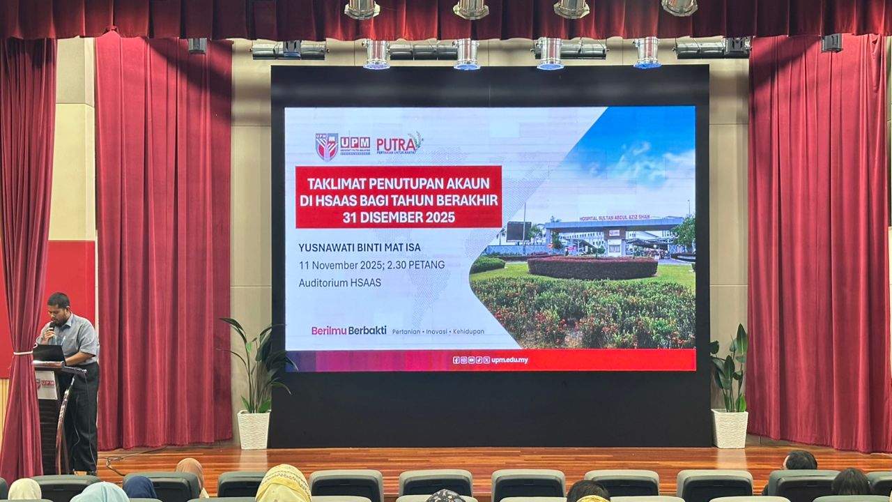 | Serdang, 11 November 2025 – The 2025 Account Closing Briefing for Hospital Sultan Abdul Aziz Shah (HSAAS) was successfully held at the HSAAS Auditorium at 2.30 p.m. The session was delivered by Ms. Yusnawati, Head of the Finance Division, and attended by staff from various units and departments. |